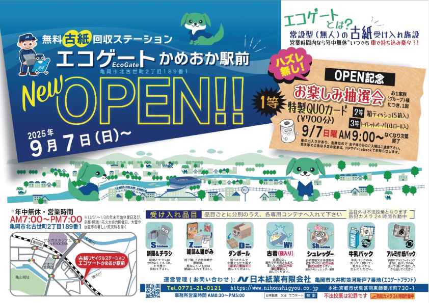 このたび、令和7年9月7日(日)JR亀岡駅南口の北古世町に、古紙リサイクルステーション エコゲートかめおか駅前をOPENいたします。 本エコゲートは、世界に誇れる環境先進都市 亀岡市のサーキュラーエコノミー(とりわけ3R)のさらなる醸成にむけた一施設として、再資源化できうる焼却ゴミ(主に紙ごみ類)の削減の一助になれば幸甚です。 また、9月7日(日)のみ、OPEN記念イベントとして、ハズレなしのお楽しみ抽選会(クオカード・箱テッシュ5箱入り・再生トイレットロール4個入り)を開催しております。